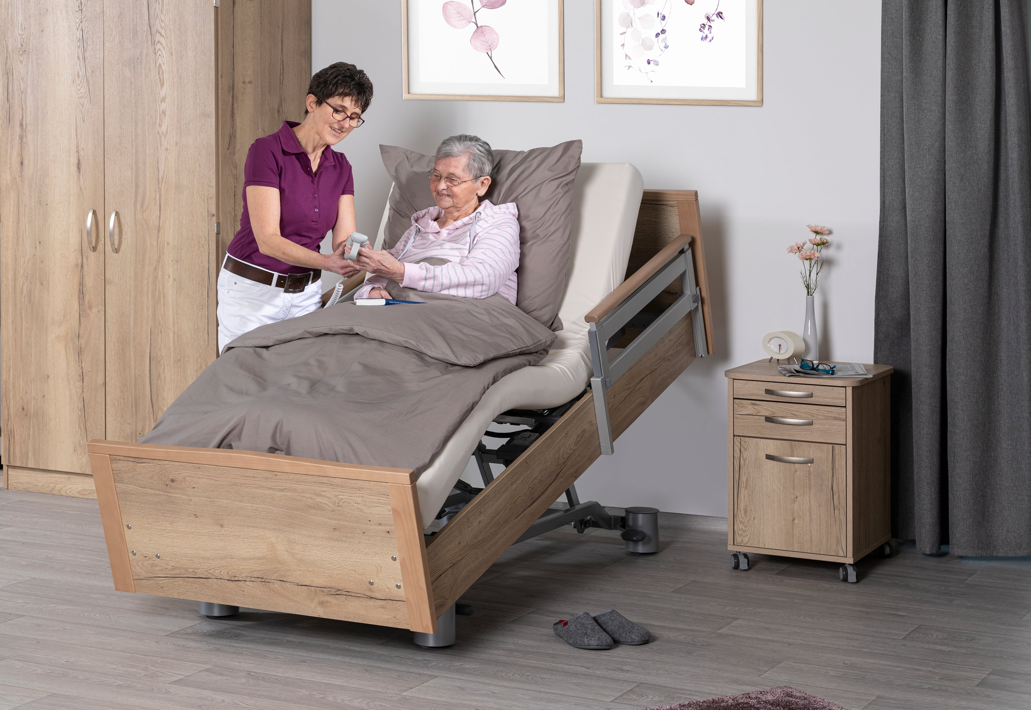 - Lit médicalisé, avec en option les accessoires correspondants tels que matelas anti-escarres, élévateur de lit, etc..