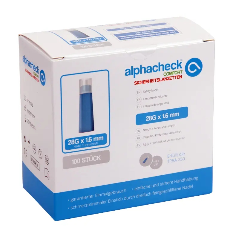 L'aiguille de la lancette de sécurité alphacheck comfort est bien cachée avant et après l'utilisation. Le triple biseau de l'aiguille garantit un prélèvement sanguin peu douloureux et un bon écoulement du sang. Grâce à la profondeur de la piqûre de 1,6 mm, cette lancette de sécurité peut être utilisée chez les personnes ayant une peau un peu plus épaisse (par ex. les hommes âgés ou les personnes effectuant un travail manuel). Le terme "comfort" dans la désignation de cette lancette de sécurité signale la rapidité de la piqûre ce qui minimise la douleur.